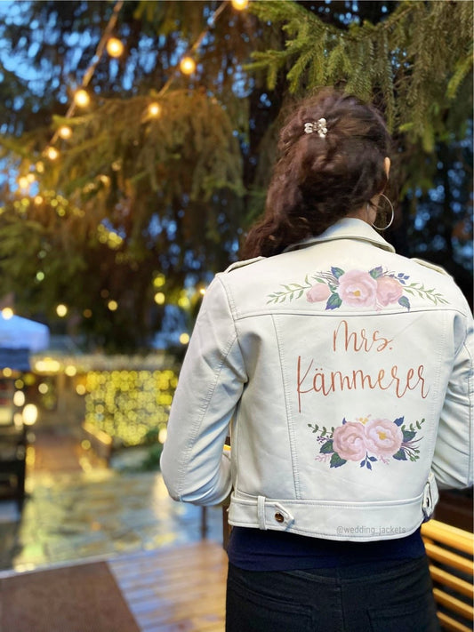White leather bride jacket, wedding dress jacket, gift for bride, painted leather jacket.