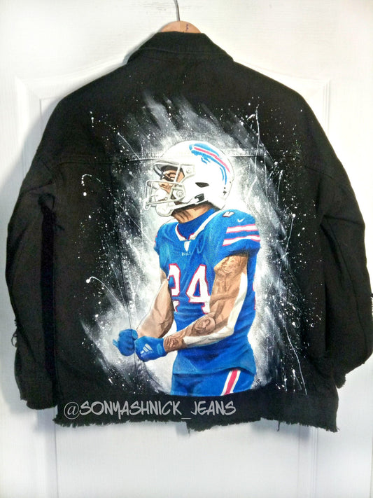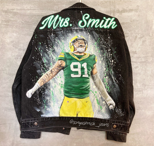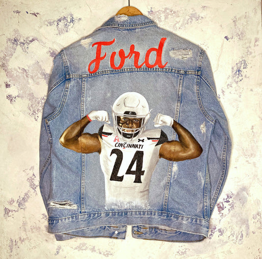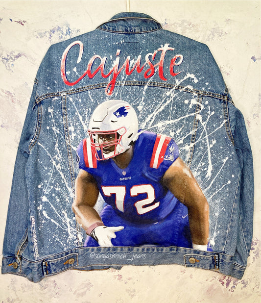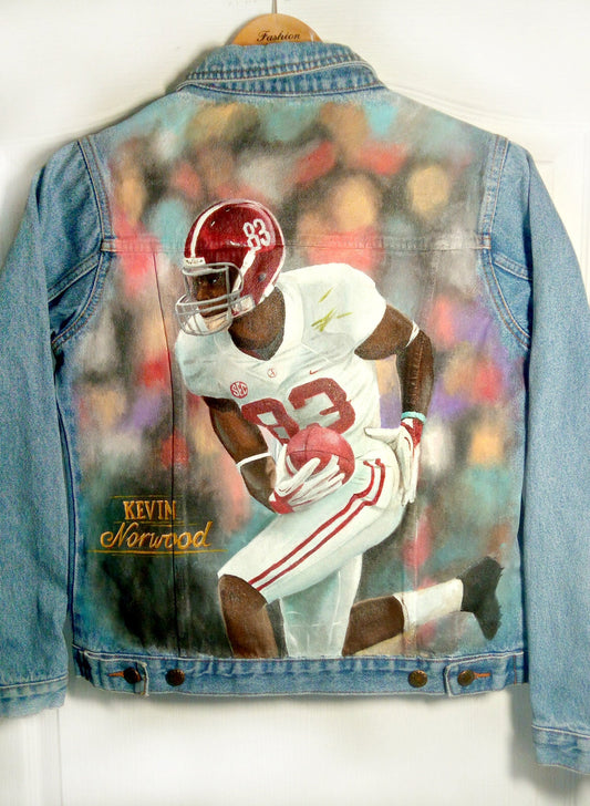Custom painted denim jacket football player