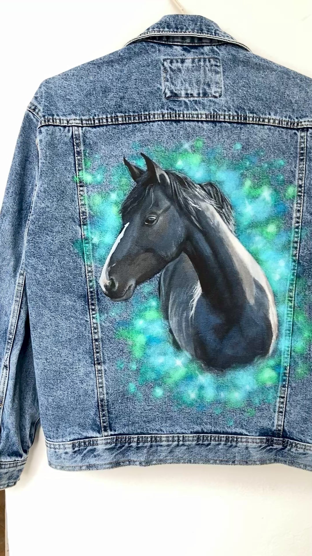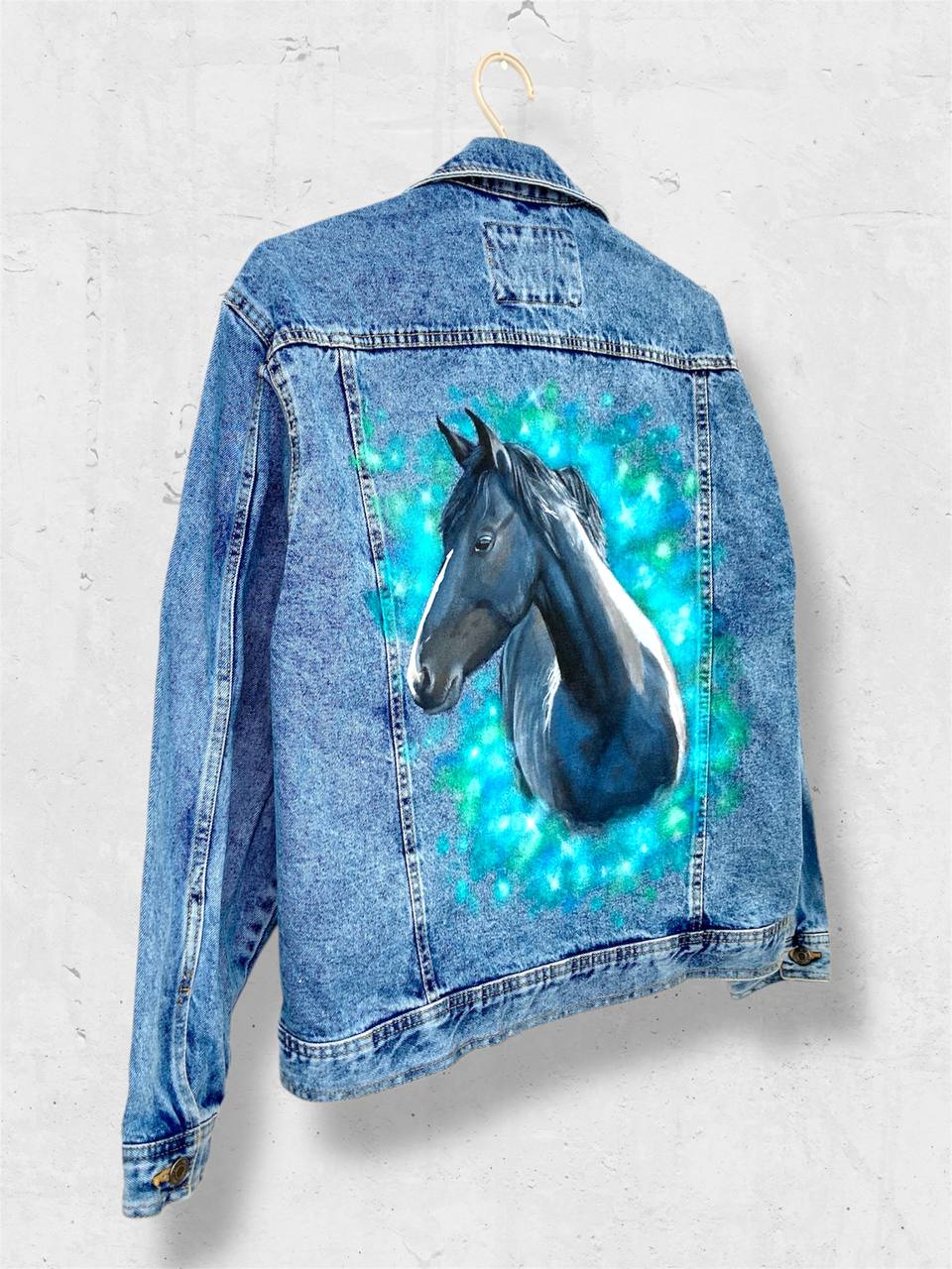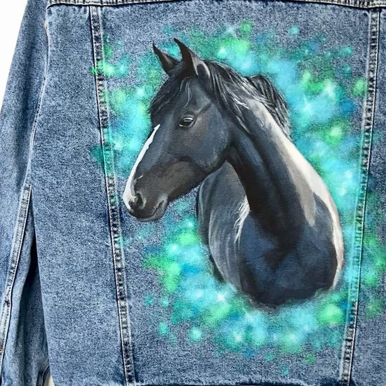 Custom painted jean jacket with a horse portrait by photo. Order custom denim jacket for you or your loved one as a gift! It can be a great personalized gift or horse lover gift!